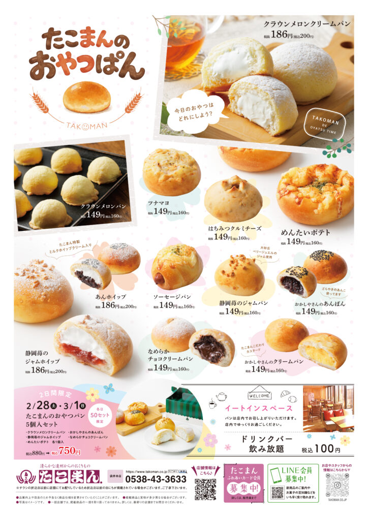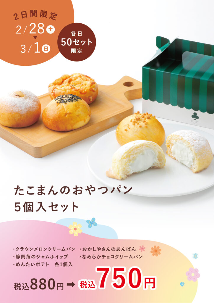 2/28(土)・3/1(日)の2日間、「たこまんのおやつパン 5個入セット」を特別価格にて販売いたします。